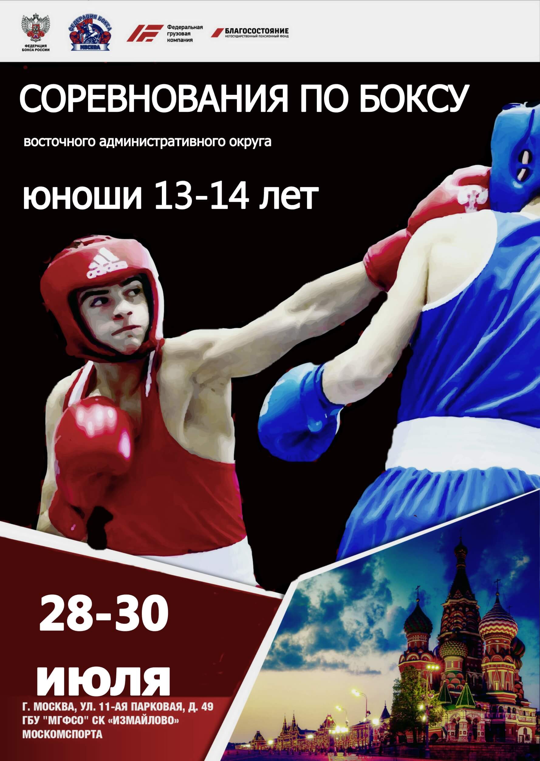 В период с 28 по 30 июля 2021 года при поддержке РОО «Федерация бокса г. Москвы» и Генерального партнера соревнований акционерного общества «Федеральная грузовая компания» пройдут Окружные соревнования по боксу среди юношей 13-14 лет по восточному административному округу города Москвы!Организаторы соревнований: РОО «Федерация бокса г. Москвы»